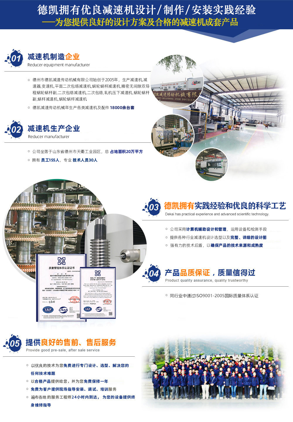 德州市德凱減速傳動機械有限公司,生產減速機,減速器,變速機,平面二次包絡減速機,蝸輪蝸桿減速機,精密無間隙雙導程蝸輪蝸桿副,二次包絡減速機,蝸輪蝸桿,軋機壓下減速機,蝸輪蝸桿副,蝸桿減速機,蝸輪蝸桿減速機,公司占地面積20萬平方,員工155人,技術人員30人,年生產各類減速機及配件18000余臺套。在同行業(yè)中通過了ISO9001質量管理體系認證。公司設備齊全、技術力量強大、檢測手段完善,引進國外大型數控二次包絡機床GJK75加工數控4臺,可加工到800二次包絡蝸輪蝸桿。引進漢江S7732蝸桿磨床3臺,精度可達5級。公司擁有輝光離子氮化爐4臺,經該設備氮化后可提高蝸桿表面硬度、耐磨性高、提高疲勞強度、變形量小、耐蝕性、...